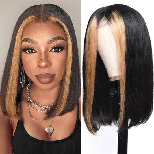 Honey Blonde Money Piece Highlight Skunk Stripe Black Bob Wig
